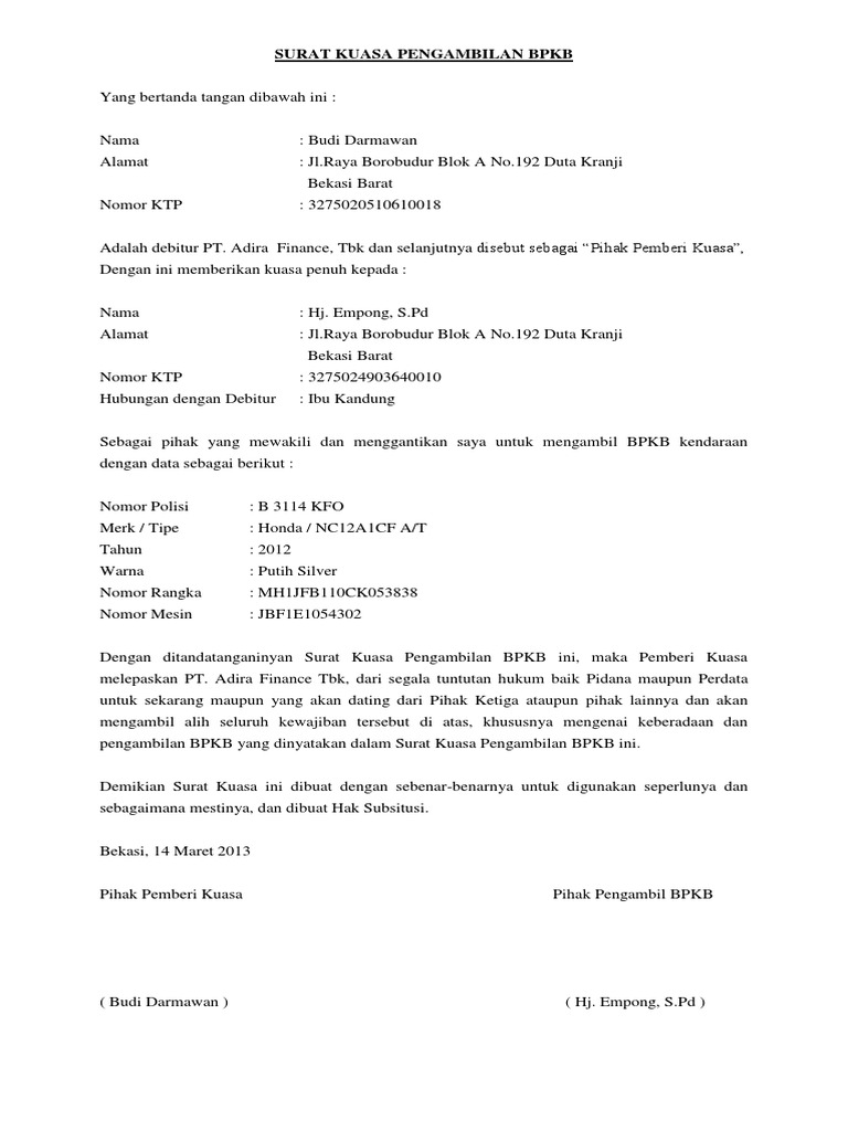 Contoh Surat Kuasa Ambil Bpkb Adira